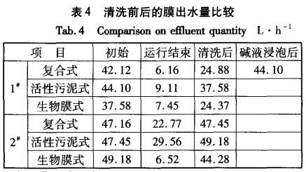膜的清洗包括5个步骤:清水浸泡;水反冲;气反冲;稀NaC10液浸泡1h;稀H2SO4液浸泡1h,如清洗后膜通量的恢复效果仍较差则再增加24h的碱液浸泡。清洗前后膜出水量的变化见表4