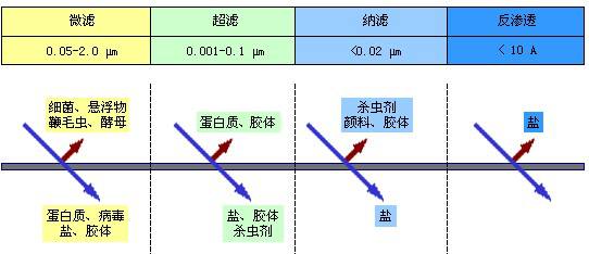 ÏÂͼÏÔʾÁËË®Öи÷ÖÖÔÓÖʵĴóСºÍÈ¥³ýËüÃÇËùʹÓõķÖÀë·½·¨¡£·´ÉøÍ¸Ö÷ÒªÓÃÀ´È¥³ýË®ÖÐÈܽâµÄÎÞ»úÑΣ»¶ø³¬ÂËÔò¿ÉÒÔÈ¥³ý²¡¶¾¡¢´ó·Ö×ÓÎïÖÊ¡¢½ºÌåµÈ£»Î¢ÂËÒ»°ãÄܹ»È¥³ýË®ÖеÄϸ¾ú¡¢»Ò³¾£¬¾ßÓкܺõijý×ÇЧ¹û¡£ÕâЩ¶¼ÊÇ´«Í³µÄ¹ýÂË£¨ÈçɰÂË¡¢¶à½éÖʹýÂ˵ȣ©ÎÞ·¨ÊµÏֵġ£