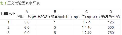Óɱí2¿É¼û£¬4¸öÒòËØ¶ÔÊÔÑé½á¹ûÓ°Ïì³Ì¶ÈΪ£ºÎ¢²¨¹¦ÂÊ>H2O2Ͷ¼ÓÁ¿>n£¨Fe2+£©¡Ãn£¨H2O2£©>³õʼ·´Ó¦pH¡£¾Õý½»ÊÔÑé³õ²½È·¶¨µÄ×î¼Ñ·´Ó¦Ìõ¼þΪA1B3C1D3£¬¼´³õʼ·´Ó¦pH=3.0£¬H2O2ÈÜҺͶ¼ÓÁ¿Îª5mL/L¡¢n£¨Fe2+£©¡Ãn£¨H2O2£©Îª1¡Ã5ºÍ΢²¨¹¦ÂÊΪ750W¡£