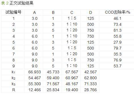 Ó°Ïì΢²¨Ç¿»¯FentonÑõ»¯·¨´¦ÀíЧ¹ûµÄÒòËØÓгõʼ·´Ó¦pH¡¢H2O2Ͷ¼ÓÁ¿¡¢n£¨Fe2+£©¡Ãn£¨H2O2£©¡¢Î¢²¨¹¦Âʼ°·´Ó¦Ê±¼äµÈ¡£ÎªÈ·¶¨Î¢²¨Ç¿»¯FentonÑõ»¯·¨´¦Àí¿¹ÉúËØ·ÏË®µÄ×î¼ÑµÄ·´Ó¦Ìõ¼þ£¬Äâ¿ØÖÆ·´Ó¦Ê±¼äΪ8min£¬Í¨¹ýËÄÒòËØÈýˮƽÕý½»ÊÔÑéÈ·¶¨Ó°Ïì´¦ÀíЧ¹ûµÄÖ÷ÒªÒòËØ£¬Õý½»ÊÔÑéÒòËØË®Æ½±í¼û±í1£¬Õý½»ÊÔÑé½á¹û¼û±í2¡£