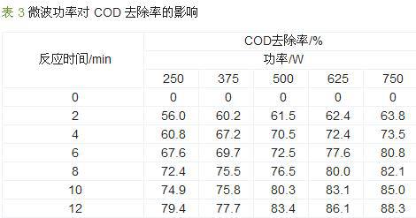¿ØÖÆ·´Ó¦³õʼÌõ¼þΪ£º·ÏË®³õʼ·´Ó¦pH=3.0¡¢H2O2Ͷ¼ÓÁ¿5mL/LºÍn£¨Fe2+£©¡Ãn£¨H2O2£©Îª1¡Ã5£¬¿¼²ì²»Í¬Î¢²¨¹¦ÂʶԷÏË®CODÈ¥³ýÂʵÄÓ°Ï죬ȷ¶¨ÊÔÑéµÄ×î¼Ñ΢²¨¹¦ÂÊ¡£ÊÔÑé½á¹û¼û±í3¡£