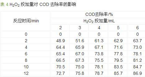 ÔÚ×î¼Ñ΢²¨¹¦ÂʵĻù´¡ÉÏ£¬¿ØÖÆ·´Ó¦³õʼÌõ¼þΪ£ºÎ¢²¨¹¦ÂÊ625W¡¢n£¨Fe2+£©¡Ãn£¨H2O2£©Îª1¡Ã5ºÍ·´Ó¦³õʼpH=3.0£¬¿¼²ìÖÊÁ¿·ÖÊýΪ30%µÄH2O2²»Í¬Í¶¼ÓÁ¿¶ÔCODÈ¥³ýÂʵÄÓ°Ï죬ȷ¶¨H2O2µÄ×î¼ÑͶ¼ÓÁ¿¡£ÊÔÑé½á¹û¼û±í4¡£