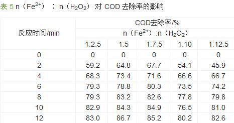 ¿ØÖÆ·´Ó¦³õʼÌõ¼þ£ºÎ¢²¨¹¦ÂÊ625W¡¢H2O2Ͷ¼ÓÁ¿5mL/L¼°³õʼ·´Ó¦pH=3.0£¬¿¼²ì²»Í¬n£¨Fe2+£©¡Ãn£¨H2O2£©¶ÔCODÈ¥³ýÂʵÄÓ°Ï죬ȷ¶¨Æä×î¼Ñn£¨Fe2+£©¡Ãn£¨H2O2£©¡£ÊÔÑé½á¹û¼û±í5¡£