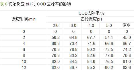 Óɱí6¿É¼û£¬³õʼ·´Ó¦pH¶Ô·ÏË®µÄ´¦ÀíЧ¹ûÓ°ÏìÏà¶Ô½ÏС£¬µ±³õʼ·´Ó¦pHΪ3.0¡«4.0ʱ£¬·´Ó¦6minʱCODÈ¥³ýÂÊ´ïµ½80%×óÓÒ£¬³öË®COD£¼120mg/L¡£ÎªÈ·±£·ÏˮʵÏÖÎȶ¨´ï±êÅÅ·Å£¬È·¶¨×î¼Ñ³õʼ·´Ó¦pHΪ3.0¡«4.0¡£