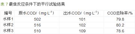 Óɱí7¿É¼û£¬ÔÚ×î¼Ñ·´Ó¦Ìõ¼þÏ£¬µ±¿¹ÉúËØ·ÏË®¶þ¼¶³öË®CODΪ502¡«516mg/Lʱ£¬·´Ó¦Ê±¼äΪ6min£¬´¦Àíºó³öË®COD£¼120mg/L£¬CODÈ¥³ýÂÊ´ïµ½78.0%ÒÔÉÏ£¬Âú×ã¡¶·¢½ÍÀàÖÆÒ©¹¤ÒµË®ÎÛȾÎïÅŷűê×¼¡·£¨GB21903¡ª2008£©¡£¡£