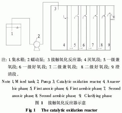 1.2 试验装置 接触氧化反应器的有效容积为60 L。厌 氧段有效容积为16L,兼氧、好氧段采用接触氧化法,有效容 积为38 L,内置网状填料,采用穿孔曝气。接种污泥取自广 州某污水处理厂生物处理二沉池。