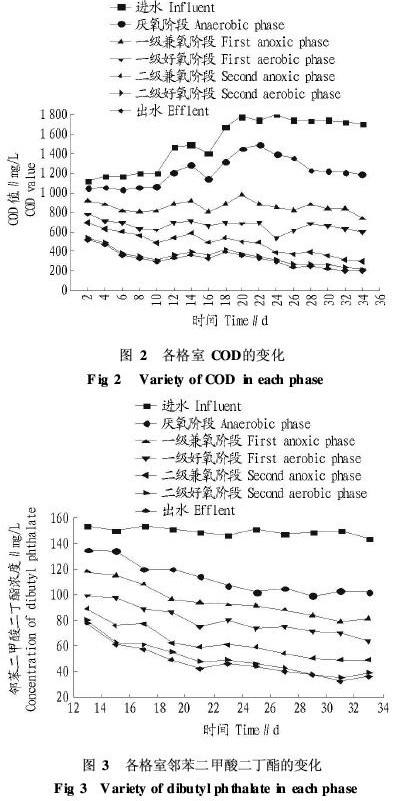 2.2.2 不同格室生物膜的厚度。由表1可知,随水流方向 COD降低,生物膜平均厚度逐渐减小;生物膜厚度随反应器 启动时间的延长逐渐增厚,最后基本稳定在一定范围内。到 第33天,一级兼氧段生物膜平均厚度达到2 412μm,而二级 好氧段生物膜厚度只有754μm,说明COD浓度越高,为微生 物提供的能量越多,生物膜越厚。一级兼氧段、一级好氧段生物膜颜色较深(深褐色),二级兼氧段、二级好氧段生物膜 颜色较浅(黄褐色)。第12天加入邻苯二甲酸二丁酯、二甲苯后生物膜发黑,微生物受到有毒物质冲击, 7d后,生物膜 又逐渐恢复到原来的颜色,说明不适应这种水质的微生物已被淘汰。观察生物膜可及时了解微生物的生长状况,从而及时发现反应器运行过程中存在的问题。