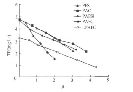 ´Óͼ1¿ÉÒÔ¿´³ö£¬¶ÔÓÚPFS¡¢PAC¡¢PAFSi¡¢PAFCºÍLPAFCÕâ5ÖÖ»ìÄý¼Á£¬³ýÁ×ÂʾùËæ¦ÂµÄÉý¸ß£¨Í¶Ò©Á¿µÄÔö¼Ó£©¶øÉý¸ß£»¦Â=2ʱ£¬5ÖÖ»ìÄý¼Á³öË®TPÖÊÁ¿Å¨¶ÈÒÀ´ÎΪPFS<LPAFC<PAFC<PAFSi<PAC¡£¶ÔÓÚÎâ¼Ò´åÎÛË®´¦Àí³§Ä¿Ç°ÕýÔÚʹÓõÄLPAFC¶øÑÔ£¬ÆäÔÚ¦Â=4.33ʱ£¬³öË®TPÖÊÁ¿Å¨¶ÈΪ0.8mg/L£¬´ïµ½¹ú¼ÒÒ»¼¶BÅŷűê×¼¡£