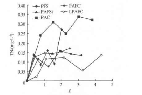 ÓÉͼ3¿ÉÒÔ¿´³ö£¬5ÖÖ»ìÄý¼Á¶ÔTNµÄÈ¥³ýÂÊûÓÐÃ÷ÏԵĹæÂÉ£¬È¥³ýÂʶ¼±È½ÏµÍ¡£PACÔÚ¦Â=3.04ʱ£¬¶ÔTNµÄÈ¥³ýÂÊ´ïµ½ÁË33.77%£¬¶øPFS¡¢PAFSi¡¢PAFC¡¢LPAFCµÄ×î¸ßÈ¥³ýÂÊ·Ö±ðÖ»ÓÐ27.19%¡¢17.44%¡¢16.02%¡¢13.58%¡£