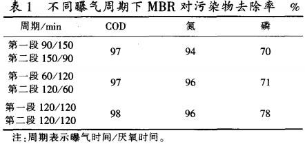 Z.Ujang等研究了两段式间歇曝气MBR系统在不同的曝气频率下对有机物及氮、磷的去除效果。实验采用日本Yuasa集团生产的聚烯烃膜材料,孔径为0.2[Lm,运行稳定后,HRT为24h,污泥龄为25d,污泥质量浓度为2500-3800mg/L,内回流比为100%。实验通过间歇曝气在两段反应器内形成好氧一厌氧环境的循环交替,并在第二段反应器内放置膜组件进行分离,从而实现COD,氮、磷的同时去除。实验分别在三个不同的曝气周期下对比MBR系统对污染物的去除能力,试验数据见表1