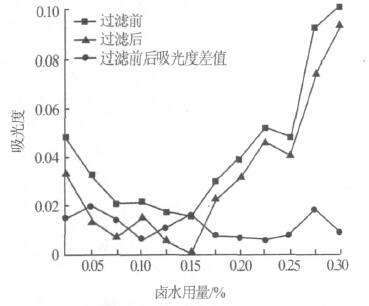 由图 2 可知:当卤水用量为0.03%~0.15%时,随着卤水用量的增加,上清液吸光度逐渐降低;当卤水用量>0.15%后,随着卤水用量的增加,吸光度又开始升高;卤水用量在0.03%~0.30%之间时,过滤前后上清液的吸光度相差不大。