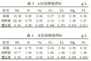 通过表3、表4可以看出,该系统对原液的浓缩倍数可达6~8倍,对二价及更高价态的金属离子有很好的截留率。对钼的截留率高达98%以上,对Cu、Fe、Ca、Mg的截留率都在80%~95%之间。对一价金属离子有较高的透过率,K、Na的透过率达60%以上。通过纳滤系统浓缩后的原液钼含量大为提高,对后续处理浓缩液提取钼极为方便。透过液各种金属离子指标较低,可以返回钼酸铵生产过程回用,达到环保效果。