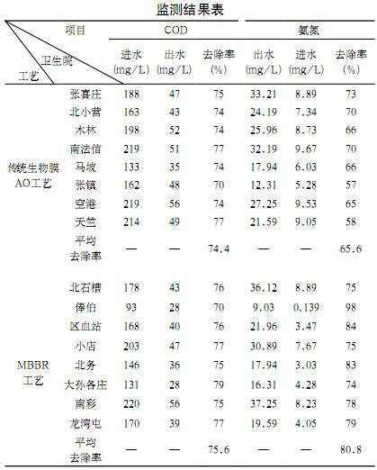以北京市顺义区各乡镇卫生院为例。该卫生院产生的医疗废水多为生活污水,处理水量为25~50m3/d,2005年至2007年针对顺义区的张喜庄、北小营、木林、南法信、马坡、张镇、空港、天竺、北石槽、俸伯、区血站、小店、北务、大孙各庄、南彩、龙湾屯等卫生院的污水进行了处理,其中前八个卫生院采用传统生物膜AO工艺,后八个单位采用MBBR工艺。工艺前端均设格栅和调节池,后端采用竖流式沉淀池和二氧化氯消毒。使用传统生物膜AO工艺的污水处理站中的A池水力停留时间为4h,O池水力停留时间为6h,回流比100%,弹性填料填充比75%,气水比15∶1。采用MBBR工艺的两个曝气池总停留时间为7h,不设回流,采用φ20×20(mm)柱状改性聚乙烯悬浮填料,比表面积510m2/m3,填充比50%,气水比10∶1,其中第二个反应池间断曝气。反应池采用下布水,池底设微孔曝气管进行曝气,出水设活动栅板。2005年12月和2007年1月经顺义区环境保护局环境监测站监测,监测结果见下表: