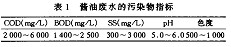 酱油废水的主要成分包括粮食残留物、发酵过程产物、酱油色素、微量洗涤剂、消毒剂、大量的盐分、各种微生物及微生物的分泌物和代谢产物。废水具有较高的BOD,COD,SS和色度,废水BOD5/COD大于0。5,易于生物降解。酱油废水的主要污染物指标如表l所示。