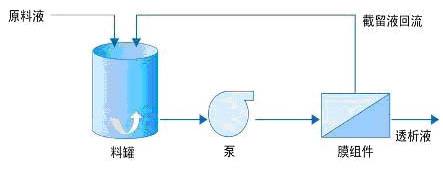 Ĥ·ÖÀëµÄ»ù±¾¹¤ÒÕÔÀíÊǽÏΪ¼òµ¥µÄ£¨²Î¼ûÏÂͼ£©¡£ÔÚ¹ýÂ˹ý³ÌÖÐÁÏҺͨ¹ý±ÃµÄ¼Óѹ£¬ÁÏÒºÒÔÒ»¶¨Á÷ËÙÑØ×ÅÂËĤµÄ±íÃæÁ÷¹ý£¬´óÓÚĤ½ØÁô·Ö×ÓÁ¿µÄÎïÖÊ·Ö×Ó²»Í¸¹ýĤÁ÷»ØÁϹޣ¬Ð¡ÓÚĤ½ØÁô·Ö×ÓÁ¿µÄÎïÖÊ»ò·Ö×Ó͸¹ýĤ£¬ÐγÉ͸ÎöÒº¡£¹ÊĤϵͳ¶¼ÓÐÁ½¸ö³ö¿Ú£¬Ò»ÊÇ»ØÁ÷Òº£¨Å¨ËõÒº£©³ö¿Ú£¬ÁíÒ»ÊÇ͸ÎöÒº³ö¿Ú¡£ÔÚµ¥Î»Ê±¼ä£¨Hr£©µ¥Î»Ä¤Ãæ»ý£¨m2£©Í¸ÎöÒºÁ÷³öµÄÁ¿£¨L£©³ÆÎªÄ¤Í¨Á¿£¨LMH£©£¬¼´¹ýÂËËÙ¶È¡£Ó°ÏìĤͨÁ¿µÄÒòËØÓУºÎ¶ȡ¢Ñ¹Á¦¡¢¹Ìº¬Á¿£¨TDS£©¡¢Àë×ÓŨ¶È¡¢ð¤¶ÈµÈ¡£