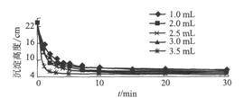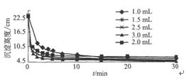 由图4可以看出,当加入质量浓度为0.5g/L的PAM3.5mL时,沉淀百降最快,且最终沉淀高度最低。但在试验过程中观察其沉降过程,其生成的絮状体易破碎,致使有