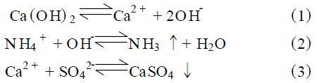味精废水经蛋白提取后,对COD 与SS 有所削减,但废水中的SO4²-浓度变化不大,pH 值为3 左右。高浓度的SO4²-、NH3-N对生化段的厌氧菌和好氧菌将产生抑制作用。据报道,SO4²-的浓度达到5000mg/ L 时,对微生物生长产生抑制作用。当NH3-N浓度高于1500~3000mg/ L 时,pH 高于7. 5 时产生抑制作用。NH3-N浓度高于3000mg/ L 时,无论pH高低,都有抑制作用。因此,必须在中和沉淀段降低SO4²-和NH3-N浓度。Ca (OH) 2 以其价格低,对SO4²-和NH3-N具明显降低作用等优点而被广泛采用,其作用机理如下: