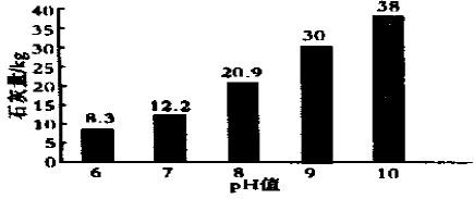 CaSO4 的溶度积Ksp = 1. 96 ×10﹣4。随着石灰量的增加,使得反应(3) 的平衡向着生成CaSO4 的方向移动。反应(2) 的平衡向着生成NH3 的方向移动。可用吹脱方法去除NH3 。而SO4²-与Ca2 +生成CaSO4 沉淀。石灰用量与pH 值的关系见图1 。随着石灰量增加,pH 值逐渐升高,当pH 值达到6 时,废水仅需石灰8. 3kg/ m3 ,而当pH = 10 时,石灰用量为38kg/ m3 ,为pH = 6 时的近5 倍。