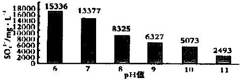 图2 、3 、4 中随着pH 值升高,SO4²-、NH4+ 、COD去除率逐渐增大, pH 值调节到6 时,SO4²-浓度为15336mg/L , NH4+ 浓度为6375mg/ L , COD 浓度为29327mg/ L ;而当pH = 11 时,SO4²-浓度为2439mg/ L ,NH4+ 浓度为2327mg/ L , COD 浓度为20730mg/ L 。SO4²-、NH4+ 、COD 分别是pH = 6 时的16 %、37 %、71 %。表明石灰用量越大,对污染物各项指标的去除效果越好,但并不经济,将大大增加废水的运行费用。其最佳pH 值为9 。。