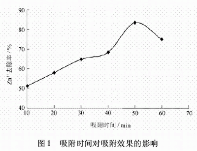 ´Óͼ1¿ÉÒÔ¿´³ö£¬Ëæ×ÅÎü¸½Ê±¼äµÄÔö¼Ó£¬Zn2+µÄÈ¥³ýÂÊÖð½¥Ôö´ó£¬Îü¸½Ê±¼äΪ50minʱÎü¸½Ð§¹û×îºÃ£¬Zn2+µÄÈ¥³ýÂÊ´ïµ½83£®5%£¬Zn2+µÄÊ£ÓàŨ¶ÈΪ1£®29mg/L¡£Îü¸½Ê±¼ä¹ý¶Ì£¬·´Ó¦²»³ä·Ö£¬´¦ÀíЧ¹û²»¼Ñ;Îü¸½Ê±¼ä¹ý³¤£¬³öÏÖ½âÎüËÙÂÊ´óÓÚÎü¸½µÄÏÖÏ󡣺óÐøÊÔÑéÎü¸½Ê±¼äΪ50min¡£