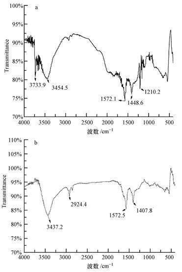 ¡¡¡¡Í¼ 4Êǹ̶¨»¯¾úÈ¥³ý²ñÓÍË®ÈÜҺǰºóµÄFTIRÆ×ͼ.ÓÉͼ 4¿ÉÖª£¬½µ½âǰ²ñÓÍË®ÈÜÒºµÄºìÍâÆ×ͼÖУ¬3850¡«3500 cm-1·¶Î§ÄÚ´æÔÚµÄ3733.9 cm-1¼°3454.4 cm-1ÎüÊշ壬ÕâÊÇÓÉÇ¿ÁÒµÄôÇ»ùÉìËõÕñ¶¯ÒýÆðµÄ(Swiatkowski et al., 2004). 2970¡«2840 cm-1Ϊ±¥ºÍ̼Ç⻯ºÏÎïµÄÌØÕ÷·å£¬Ïµ¼×»ù¡¢ÑǼ׻ùºÍ´Î¼×»ùµÄÉìËõÕñ¶¯ºÍÍäÇúÕñ¶¯ÎüÊÕ·å.1572.1 cm-1´¦³öÏÖµÄÇ¿ÁÒÉìËõÕñ¶¯·åΪ±½»·¹Ç¼ÜÕñ¶¯²úÉú(Cabal et al., 2009)£¬1470¡«1430 cm-1·¶Î§ÄÚµÄ1448.6 cm-1ÎüÊÕ·åΪC¡ªCH3ÍäÇúÕñ¶¯·å£¬ÔÚ1250¡«1150 cm-1ÇøÄÚ³öÏÖµÄ1210 cm-1·åΪ֧Á´ÍéÌþµÄC¡ªC¹Ç¼ÜÕñ¶¯ÎüÊÕ·å.²ñÓͽµ½âºóºìÍâÆ×ͼÖУ¬ÔÚ3495¡«3430 cm-1³öÏÖµÄ3437.2 cm-1·åΪ·¼ÏãÖÙ°·µÄÉìËõÕñ¶¯·å£¬2924.4 cm-1¸½½üµÄÎüÊÕ·åΪôÈËáµÄÌØÕ÷·å£¬1410¡«1310 cm-1·¶Î§ÄÚµÄ1407.8 cm-1·åΪõ¥À༰´¼ÀàµÄÇ¿ÁÒÉìËõÕñ¶¯·å.±È½Ï½µ½âǰºóµÄ²ñÓÍË®ÈÜÒºµÄºìÍâͼÆ×·¢ÏÖ£¬¹Ì¶¨»¯¾úÌåϵÄܹ»ÓÐЧµØ´¦Àí²ñÓÍÖеIJ»Í¬×é·Ö£¬¾·´Ó¦ºó£¬´úл²úÎïÖÐÓÐôÈËáÀà¡¢õ¥Àà¡¢´¼ÀàµÈÎïÖʲúÉú.ºÎÁ¼¾ÕµÈ(2004)Ñо¿±íÃ÷£¬Ê¯ÓÍÀàÎïÖÊÔÚ΢ÉúÎïµÄ×÷ÓÃÏ£¬Öмä²úÎïÍùÍùÒÔÖ¬·¾ËáÀàÎïÖʾӶà. ¶ÌÁ´ÍéÌþµÄÑÇÄ©¶ËÑõ»¯Îª´¼ºÍÏàÓ¦µÄÖ¬·¾Ëá(Forney et al., 1968);Ö±Á´ÍéÌþµÄ΢ÉúÎï½µ½â;¾¶ÒÔµ¥Ä©¶ËÑõ»¯ºÍ˫ĩ¶ËÑõ»¯Éú³É¶þÔªôÈËáΪÖ÷(McKenna et al., 1970);·¢Éúµ¥Ä©¶ËÑõ»¯Ê±£¬ÍéÌþÑõ»¯ÎªÏàÓ¦µÄÈ©ºÍÖ¬·¾Ëá;¶ø·¢Éú˫ĩ¶ËÑõ»¯£¬ÔòÊÇÍéÌþ±»×ª»¯³É¶þÔªôÈËá(Scheller et al., 1998). Õâ±íÃ÷²ñÓ͵Ľµ½â¹ý³ÌÖв»½öÓе¥Ä©¶ËÑõ»¯¡¢´ÎÄ©¶ËÑõ»¯£¬Í¬Ê±»¹ÓÐ˫ĩ¶ËÑõ»¯.