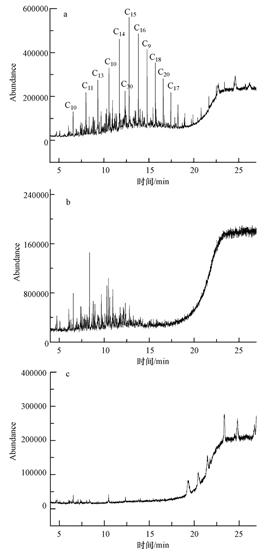ͼ 5 ÓÎÀë¾úºÍ¹Ì¶¨»¯¾ú½µ½â²ñÓÍÈÜÒºµÄGC-MSͼ(a.²ñÓÍÈÜÒº¿Õ°×¶ÔÕÕ×é; b.ÓÎÀë¾ú½µ½â²ñÓÍÈÜÒº;c.¹Ì¶¨»¯¾ú½µ½âºóµÄ²ñÓÍÈÜÒº)