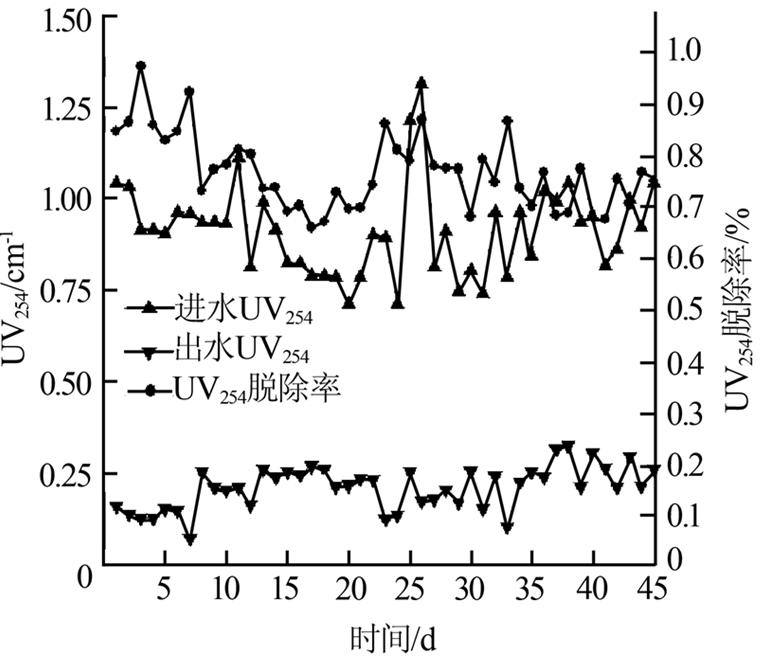 ¡¡¡¡ÓÉͼ 5¡¢Í¼ 6¿É¼û,³öˮƽ¾ùCODСÓÚ60 mg/L,ƽ¾ùÍѳýÂÊ´óÓÚ50%,»ù±¾´ïµ½¹ú¼ÒÔÙÉúË®µÄË®ÖÊÒªÇó¡£UV254ÊǺâÁ¿Ë®ÖÐÓлúÎïÖ¸±êµÄÒ»ÏîÖØÒª¿ØÖƲÎÊý,³öË®UV254µÄƽ¾ùÖµÔÚ0.25 cm-1ÒÔÏÂ,ƽ¾ùÍѳýÂÊ´óÓÚ70%,·ÏË®¾¹ýÉúÎï»îÐÔÌ¿¼¼Êõ´¦Àíºó,Îü¹âÖµÔÚ254 nm´¦µÄÎïÖÊÒѱ»ÓÐЧȥ³ý¡£ËµÃ÷ÉúÎï»îÐÔÌ¿¼¼ÊõÔÚ·ÏË®Éî¶È´¦ÀíÁìÓòÓнϴóµÄÓ¦ÓÃǰ¾°¡£