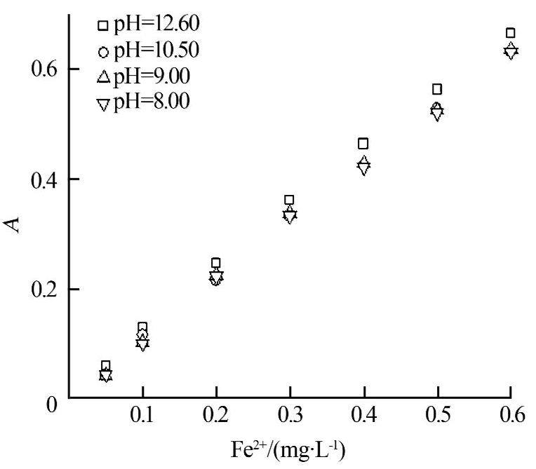 ¡¡¡¡ÓÃÁÚ±½¶þ·Ó×Ï·¨²â¶¨Ìúʱ£¬ÏÔÉ«ÌåϵµÄpHÒÔ10.5ºÍ12.6ΪºÃ[10, 11]¡£¶øFe2+ÔÚÇ¿¼îÐÔÌõ¼þÏÂÒ×ÐγÉFe(OH)2³Áµí£¬Òò´ËÔÚ²»Ó°ÏìÁÚ±½¶þ·Ó×ÏÓëFe2+Õý³£ÏÔÉ«µÄǰÌáÏÂÒËÊʵ±½µµÍ»º³åÈÜÒºµÄpH¡£°´1.2·Ö±ðÊÔÑéÁËpHΪ12.60¡¢10.50µÄÅðɰ-NaOH»º³åÈÜÒº¼°pHΪ9.00¡¢8.00µÄÅðɰ-ÅðËỺ³åÒº¶ÔÏÔÉ«·´Ó¦µÄÓ°Ï죬½á¹û¼ûͼ1¡£