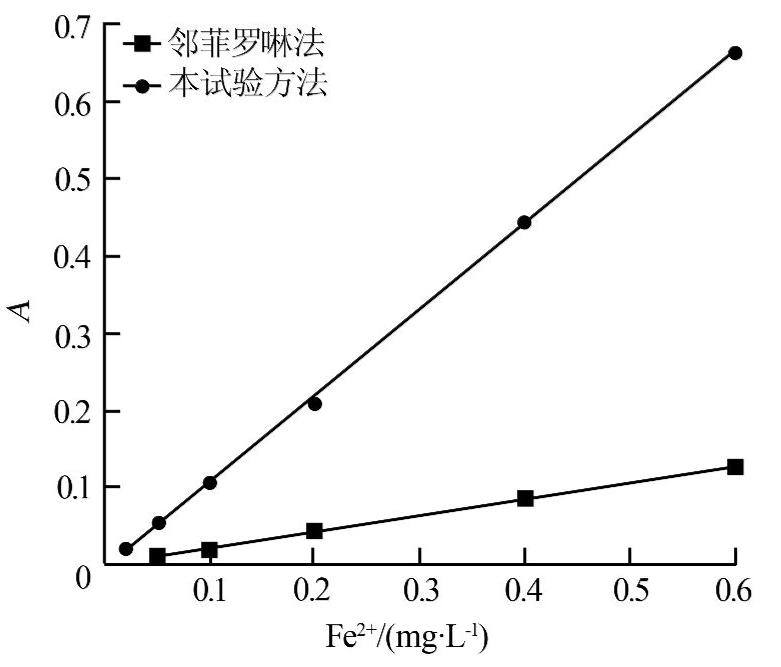 ¡¡¡¡½á¹û±íÃ÷£¬±¾ÊÔÑéÖÐFe2+ÖÊÁ¿Å¨¶ÈÔÚ0.02¡«0.6 mg/L·¶Î§ÄÚ·ûºÏÀʲ®±È¶û¶¨ÂÉ£¬Îü¹â¶ÈԼΪÏàͬŨ¶ÈÏÂÁÚ·ÆÂÞßø·¨µÄ5±¶¡£¹¤×÷ÇúÏßµÄÏßÐÔ·½³ÌA = 1.110c-0.004£¬ÏßÐÔÏà¹ØÏµÊýr2=0.999£¬¼ì³öÏÞ0.012 mg/L¡£