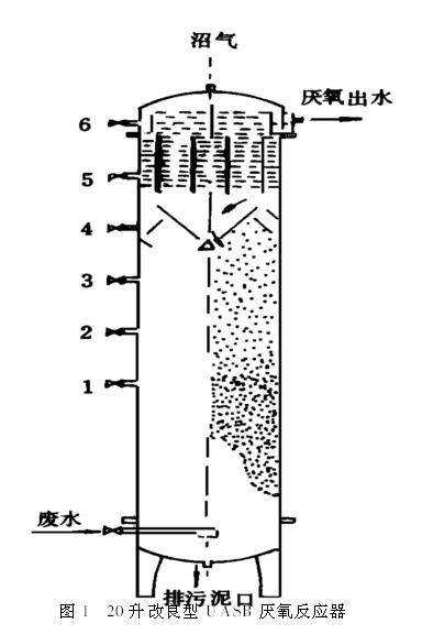 厌氧反应器由布水器,污泥床,悬浮污泥层,三相分离器,截留过滤层和气室等6个部分组成。装置容积20升,整个厌氧消化装置置于38℃的大型恒温箱内,进水由电子微量泵提升,连续运转作业。工艺流程见图2。