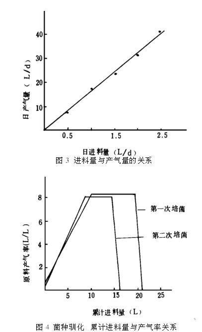 (2)接种污泥的驯化受底物浓度的影响较大,本试验第一期结果表明,当累计进料21.2升时,即驯化第10天,产气量开始下降,至第11天,菌种活性受到抑制,基本不产气。第二期也有类似结果,当累计进料15.9升时,又重复出现上述抑制现象。