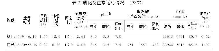 1.4 厌氧发酵采用38℃中温两步发酵,酸化及厌氧发酵均全天连续进料,酸化罐日进料2.4升,滞留期1.66天,厌氧反应器日进料2.4升,滞留期为8.33天,回流比为1(废水)∶2(厌氧出水)。