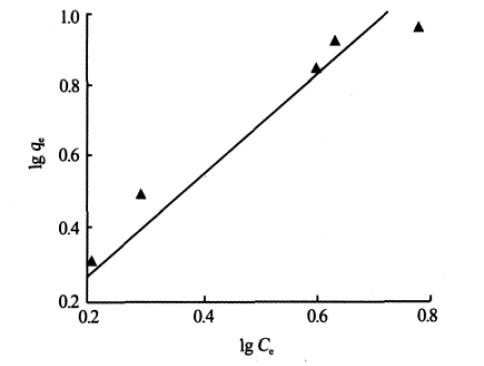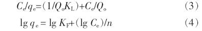 在一定的温度条件下, 生物吸附剂对金属的吸附量,常用Langmuir 和Freundlich 吸附等温线进行描述〔11〕,见式(3)、式(4)。