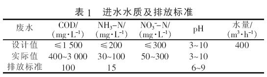 1 工程概况某尼龙化工厂主要生产装置有环己醇、己二酸、己二胺、成盐、苯精制、硝酸、切片、制氢等装置,各装置排出的废水种类多、成分复杂,废水中含苯、己二胺、己二酸、环己醇等苯系物、低聚物和硫化物,氨氮和有机氮含量高,废水可生化性差,处理难度大。各种废水汇总到污水站的调节池混合均质后进入污水处理系统。原有工艺采用传统的A/O 工艺,处理后出水COD 在100~200 mg/L 波动,氨氮在10~50 mg/L 波动,达不到排放标准,同时公司于2010 年新建2 套生产装置,废水量增大,原废水处理系统处理能力不足。为此公司决定对原有工艺进行改进,在前期试验的基础上,在现有2 套A/O 系统基础上,新建1 套A/O 系统, 建成后3 套A/O 系统并联运行,同时引入装填了高效生物载体的固定化厌氧生物滤池(3T-AF),使初沉池的出水先进入3T-AF 处理后再进行A/O 处理, 目的是使绝大部分NO3--N、NO2--N、COD 在3T-AF 段得到去除, 以减轻后续A/O 段的运行负荷。废水的水质及排放标准见表1。