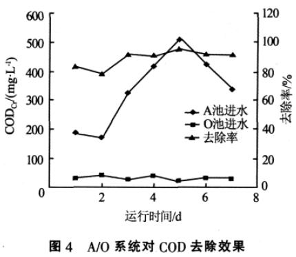 由图4 可知,AF 池出水进入A/O 系统与回流的消化液混合后的COD 在150~500 mg/L 左右,一部分COD 在A 池作为碳源被反硝化细菌利用,剩余部分进入O 池内,通过好氧池内微生物的分解和活性污泥的絮凝作用,使出水COD 降到50 mg/L 以下,A/O 系统对COD 的去除率稳定在70%以上。