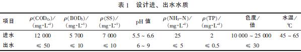 企业的废水量为4 000 m3/d,其中生产废水量为3 800 m3/d,生活污水量为200 m3/d,平均废水量约为170 m3/h,设计进、出水水质见表1。