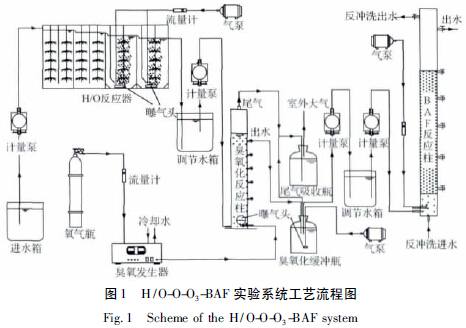 实验装置的处理能力为28. 8 L/d,24h 连续运行。工艺流程如图1 所示,反应器均为有机玻璃制作。其中H/O 反应器为装有组合填料的折流板式反应器,水解酸化段有效容积为24 L,好氧段有效容积为24 L; 臭氧化系统由臭氧发生器、臭氧化反应柱、臭氧缓冲瓶及尾气吸收装置组成,臭氧制备采用SK-CGF-10P 型氧气源臭氧发生器,反应柱由有机玻璃制成,内径55 mm,高为1 000 mm,有效容积为2 L,臭氧缓冲瓶有效容积3 L,内设残留臭氧空气吹脱装置,尾气由NaOH 和Na2S2O3溶液的吸收瓶后排向室外; BAF 反应柱内径为55 mm,高2 200mm,承托层高为200 mm,填料层高为1 500 mm,内装2~4 mm 粒径的陶粒填料,清水区高为500 mm。