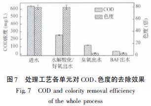 工艺稳定运行期间对COD、色度的去除效果如图7 所示。H/O 工艺单元、臭氧氧化单元、BAF 单元对其进水COD 的平均去除率分别为60. 3%、52. 3%和66. 3%,组合工艺对COD 的去除率平均为93. 6%,最终出水的COD 平均降至50 mg/L 以下,达到一级A 标准要求; 色度主要在臭氧氧化单元被去除,实验中发现,当进水的色度平均在80 倍左右时,臭氧氧化10 min 即可以使废水的色度降至4 倍以下,平均去除率高达95%以上。