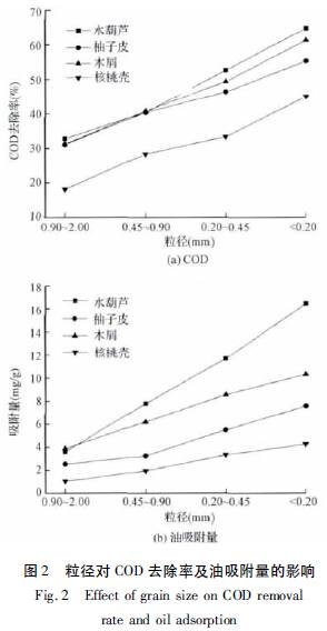由图2 可知,生物质粒径越小,处理效果越好,粒径<0.2 mm时处理效果最优; 这与相关研究吻合,颗粒粒径减小,总表面积增大,增加了生物质在外表面的吸附几率,而粒径越大,传质扩散阻力越大,影响处理效果。粒径越小,材料整体毛细孔越丰富,根据毛细管凝聚理论,微孔有利于油脂之间相互作用,所以当粒径较小时不仅有表面吸附作用,可能还会产生微孔填充效应,从而增加处理材料对有机物和油脂的吸附量。而同一粒径下,处理效果由大到小分别水葫芦、木屑、柚子皮、核桃壳; 水葫芦对COD的去除率达到65%左右、油脂吸附量为16.42 mg/g。