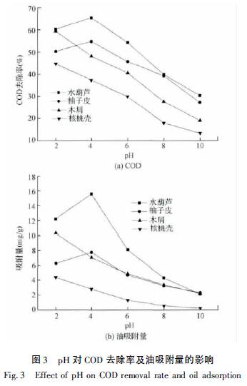 由图3 可知,pH 对餐饮废水处理效果影响显著,处理效果随着pH 增加而降低。pH 为4 时,水葫芦、柚子皮处理效果最优,COD 去除率分别达到了65.49%和54.77%,油脂的吸附量分别为15.56mg/g 和7.77 mg/g; 而pH 为2 时,木屑和核桃壳处理效果最优。柚子皮和水葫芦的纤维素含量高于木屑和核桃壳,pH 为2,酸性较强时,可能一部分有机物浸溶到废水中,贡献了COD,使去除率降低。总体来看酸性条件更有利于处理,在此条件下有机化合物和油脂表面带负电荷,而生物质材料表面带正电荷,产生静电吸附,而pH 太大,降低处理效果。