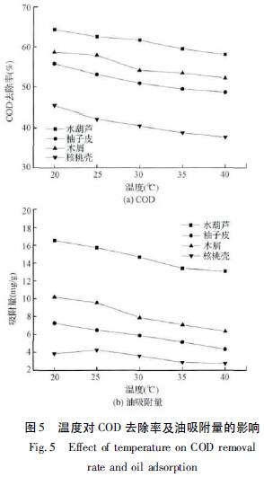 由图5 可知,温度对处理效果的影响较小,随着温度的升高,COD 去除率和油脂吸附量逐渐降低,但变化较小。温度在20~40℃范围内,生物质材料对COD 的去除率变化在6%~8% 之间; 由图5(b) 可知,随温度变化,每种生物质油脂吸附量变化不超过3 mg/g。温度升高,油脂吸附量逐渐降低,表明油脂在生物质材料上的吸附是放热反应,低温有利于吸附,餐饮废水在室温下即可处理,不需特意升高温度。
