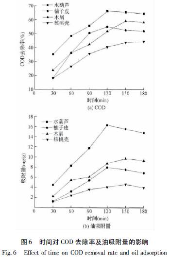 由图6 可知,生物质材料对餐饮废水的处理效果随着时间的延长而逐渐显著,并趋于稳定。由图6(a) 可知,对于COD 去除率,水葫芦、柚子皮处理2h 后趋于平衡,而木屑、核桃壳处理2.5 h 后达到了平衡; 水葫芦、柚子皮、木屑达到平衡后处理效果均有不同程度的下降。由图6(b) 可知,水葫芦和柚子皮在2 h 内油脂的吸附量达到平衡,而水葫芦对废水中的油的吸附效果明显,呈直线上升趋势,而其他3 种生物质吸附效果变化缓慢。水葫芦的快速吸附表明油脂分子在水葫芦表面快速扩散,固液两相接触面积大,有利于油脂分子向水葫芦表面活性位点的扩散。