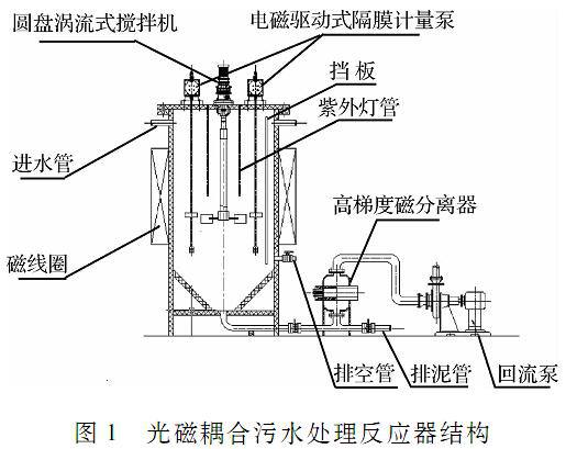 光磁耦合污水处理反应器主体部分由反应容器、紫外灯管和磁线圈组成,辅助部分由磁分离器和回流泵组成"如图+所示$。其工作原理是'装置进行工作时,搅拌机和紫外灯管在同一供电系统下同时工作;污水由进水口进入,同时磁性光催化材料通过计量泵加入到装置内部;然后在搅拌作用下和紫外光照条件下,磁性光催化材料和污水进行反应;反应后静沉一段时间,打开控制阀导出沉淀物,然后沉淀物通过高梯度磁分离器将磁性光催化剂分离出来,污泥从排泥管排出,磁性光催化剂通过控制阀在回流泵作用下重新加入到新的反应中,实现磁性光催化材料的回收利用。