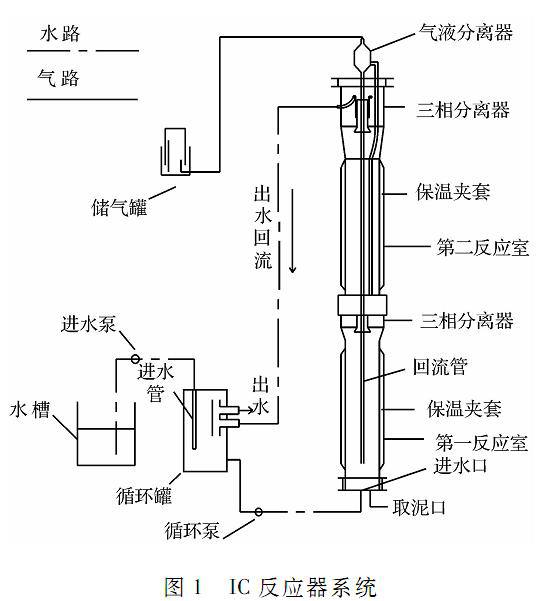 实验装置如图1所示,IC反应器高2m,直径0.1m,总体积16L。进水泵将水槽中的废水泵入循环罐,和回流出水混合,部分废水再由循环泵由反应器底部泵入反应器,循环罐中安装有一个立管,厌氧反应器的出水被收集在立管中,部分出水从立管的底部与原废水相混合,其余出水会从立管中溢流排出。产气经三相分离器后,由气体流量计测量产气量。反应器外部设有保温夹套,通过恒温水浴箱水流循环保持反应器温度在(37±1)°C。。