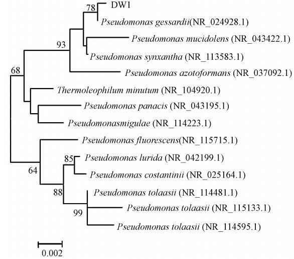 ¡¡¡¡Í¨¹ý¶Ô¾úÖêDW1½øÐÐ16S rDNAÀ©Ôö¡¢¿Ë¡²âÐòºóµÃµ½´óСΪ1498 bpµÄÐòÁУ¬ÏµÍ³·¢ÓýÊ÷½á¹ûÏÔʾ(¼ûͼ 2)DW1ÓëPseudomonas gessardii (NR_024928.1)¾ÛÓÚͬһ¸ö·ÖÖ§ÉÏ£¬ÐòÁÐÏàËÆÐÔ´ï99%£¬½áºÏÐÎ̬¹Û²ìºÍÉúÀíÉú»¯ÌØÐÔ(±í 2)£¬DW1³õ²½¼ø¶¨ÎªPseudomonas sp..