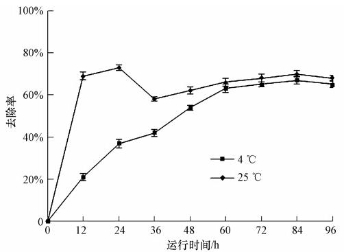 ¡¡¡¡×°ÒºÁ¿Îª100 mLÎÛË®/250 mLÈý½ÇÆ¿£¬Í¶¼ÓÄÍÀä¾úºó·Ö±ðÓÚ4 ¡æ¡¢25 ¡æ¡¢150 r ¡¤ min-1Õñµ´´¦Àí96 h£¬Ã¿¸ô12 hÈ¡1´ÎÑù£¬ÅàÑøÎï¾5000 r ¡¤ min-1£¬25 minÀëÐÄÈ¡ÉÏÇåÒº²â¶¨COD£¬¼ÆËãÆäÔÚµÍΡ¢³£ÎÂÏÂCODµÄÈ¥³ýÂÊ.