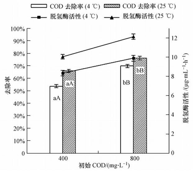 ͼ 4 ³õʼCOD¶ÔCODÈ¥³ýÂʼ°DHA»îÐÔµÄÓ°Ïì(×¢£º²»Í¬Ð¡Ð´×Öĸ±íʾͬһζÈϲ»Í¬´¦ÀíµÄCODÈ¥³ýÂʵIJîÒìÏÔÖø(p<0.05)£¬²»Í¬´óд×Öĸ±íʾͬһζÈϲ»Í¬´¦ÀíµÄCODÈ¥³ýÂʵIJîÒ켫ÏÔÖø(p<0.01)£¬ÏÂͬ)