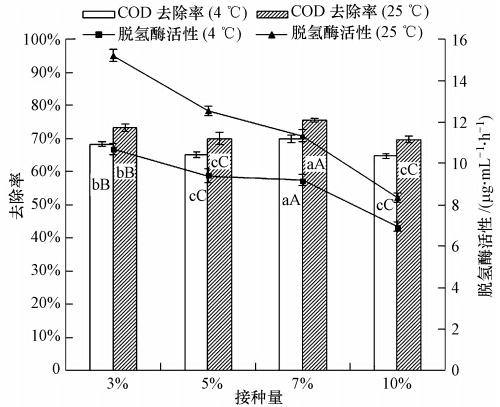 ¡¡¡¡µÍÎÂʱ£¬ÎÛË®ÖÐCODÈ¥³ýÂÊÔÚ65%×óÓÒ£¬ÆäÖнÓÖÖÁ¿Îª7%ʱ×î¸ß£¬Îª69.9%(ͼ 5)£¬Í¬Ê±DHA»îÐÔ½éÓÚ6.5¡«11.0 ¦Ìg ¡¤ mL-1 ¡¤ h-1Ö®¼ä£¬½ÓÖÖÁ¿Îª3%ʱ£¬DHA»îÐÔ×î¸ß£¬½ÓÖÖÁ¿Îª5%¡¢7%ʱ´ÎÖ®£¬½ÓÖÖÁ¿Îª10%ʱ£¬DHA»îÐÔ×îµÍ.³£ÎÂʱ£¬ÎÛË®ÖÐCODÈ¥³ýÂÊÔÚ75%×óÓÒ£¬Î¬³ÖÔڽϸßˮƽ£¬DHA»îÐÔ½éÓÚ8.3¡«15.2 ¦Ìg ¡¤ mL-1 ¡¤ h-1Ö®¼ä£¬½ÓÖÖÁ¿Îª3%ʱ£¬DHA»îÐÔ×î¸ß£¬½ÓÖÖÁ¿Îª5%¡¢7%ʱ´ÎÖ®£¬½ÓÖÖÁ¿Îª10%ʱ£¬DHA»îÐÔ×îµÍ.