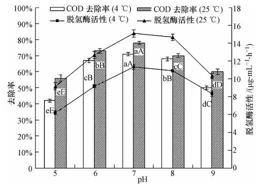 ¡¡¡¡Ê¹ÓÃ1 mol ¡¤ L-1µÄH2SO4ºÍ1 mol ¡¤ L-1µÄNaOH½«Ä£ÄâÎÛË®pHÖµ·Ö±ðµ÷Ϊ5.0¡¢6.0¡¢7.0¡¢8.0¡¢9.0£¬Í¶¼ÓÄÍÀä¾úºó·Ö±ðÓÚ4 ¡æ¡¢25 ¡æÒ¡´²ÅàÑø96 h£¬¼ÆËãÆäÔÚµÍΡ¢³£ÎÂÏÂCODµÄÈ¥³ýÂʼ°DHA»îÐÔ.