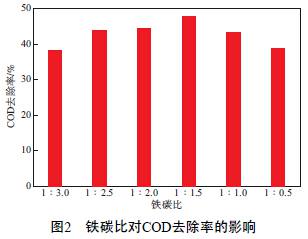 ÏòÁ¿Í²Öзֱð¼ÓÈë50 g²»Í¬Ìú̼±ÈµÄÌîÁÏ£¬ÔÙ¼ÓÈë200 mL pH=2.0¡¢COD=8 713 mg/LµÄ·ÏË®½øÐÐÔ¤´¦ÀíʵÑé¡£¾ÆØÆø´¦Àíºó£¬²â¶¨Ë®ÑùCOD£¬¼ÆËãCODÈ¥³ýÂÊ¡£Ìú̼±È¶ÔCODÈ¥³ýÂʵÄÓ°Ïì¼ûͼ2¡£ÓÉͼ2¿É¼û£¬µ±Ìú̼±ÈΪ1¡Ã1.5ʱ£¬CODÈ¥³ýÂÊ×î¸ß£¬´ï47.6%¡£Òò´Ë£¬Ñ¡ÔñÌú̼±ÈΪ1¡Ã1.5½ÏÊÊÒË¡£